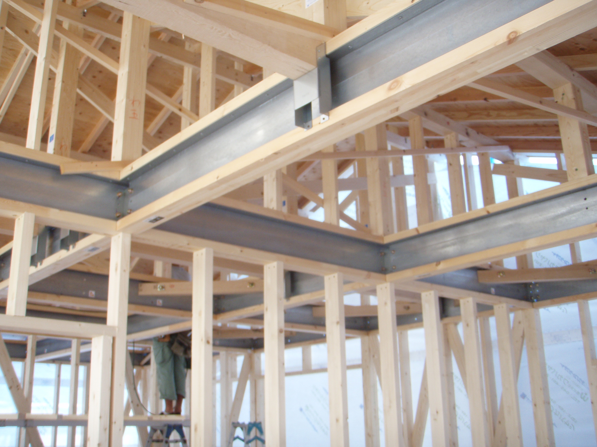 1階床の下地工事中です。大引き、鋼製束を取り付けて行きます。鋼製束は、防腐処理された部材を使用しています。