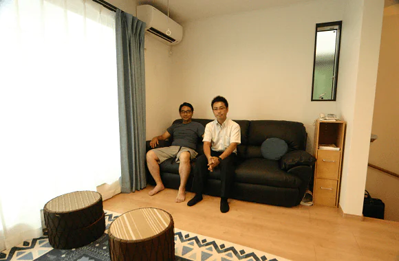 Aさんと一緒に暮らす息子さん(左)と、営業担当の高橋さん(右)。「建てた後、冷蔵庫を2階に運ぼうとしたら階段の幅が足りなくてつかえてしまって。ワカバヤシさんに連絡したら、すぐに手すりを取り外して対応してくれました。もちろん手すりはすぐに取り付け直してくれて。困ったことがあったらすぐに駆けつけてくれるので、本当に助かってます」